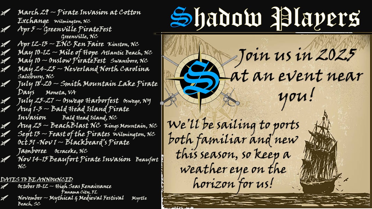 The Shadow Players perform at events up and down the East Coast, across the country, and have even made appearances in Canada and the Bahamas! We also offer stage combat workshops during the off-season. Contact us today to hire us for your event!